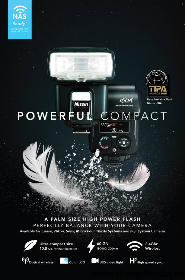 Nó phù hợp cho việc chụp ảnh gia đình, chụp trong nhà/ngoài trời, và đặc biệt phù hợp với việc chụp ảnh du lịch. Phạm vi zoom tự động điều chỉnh của đèn từ 24mm-200mm, và có thể đạt tới tiêu cự 16mm khi chụp cùng với miếng khuếch tán ánh sáng tích hợp. Đèn flash Nissin i60a phù hợp cho việc chụp ảnh gia đình, chụp trong nhà/ngoài trời, và đặc biệt phù hợp với việc chụp ảnh du lịch.