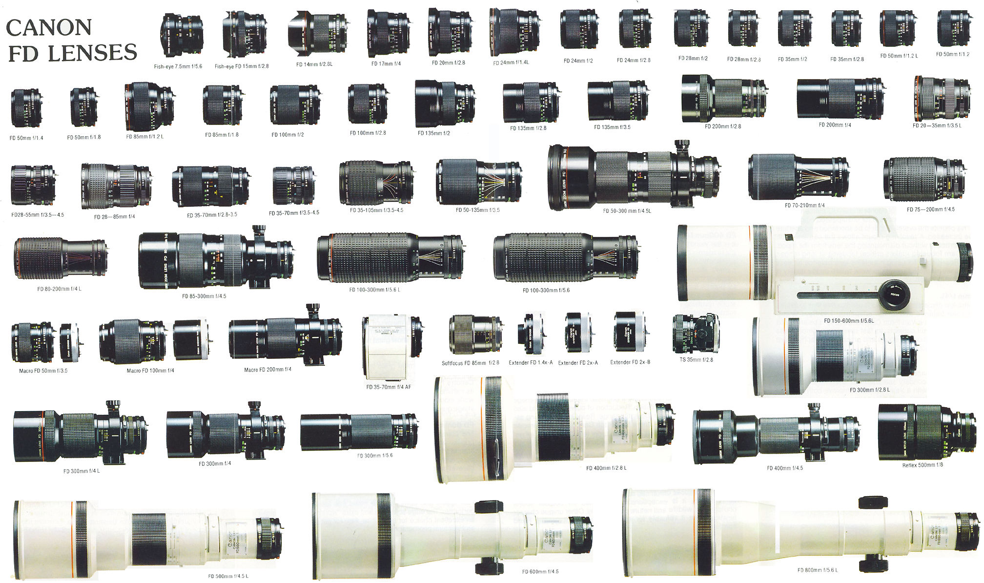- Năm 1978-1986: Canon FDn (FD new): bỏ chữ SSC/SC khắc trên tên, sơn đen toàn bộ lens, coating L cho tán xạ thấp (vòng đỏ) thần thánh ra đời mở ra kỷ nguyên mới của ống kính Canon.